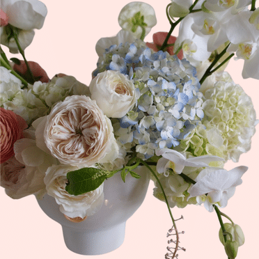 Cunt Butterfly celebrates fierce femininity. This arrangement is built on a base of clouds of pure white and accented by blush garden roses and two shades of flirty pink — peach and coral.